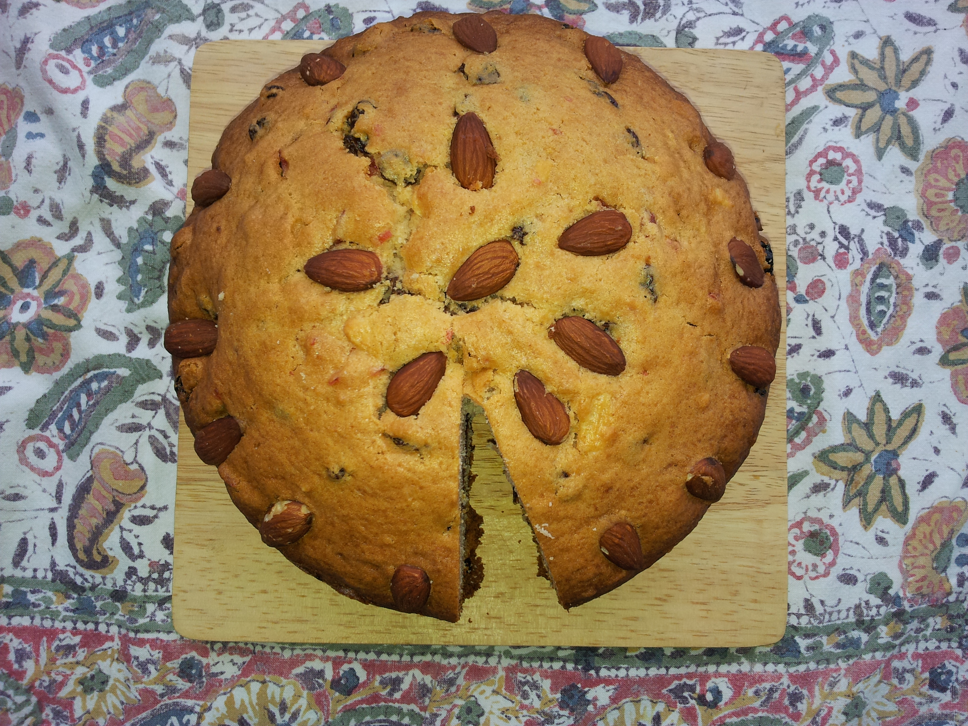 But, it got me thinking. You see, the cake, through the oven doors and outside of them looked perfect. Lightly bronzed on top and decorated with a festoonery of almonds, it promised moist mouthfuls of yummy rich fruit captured and held in a sensitive cakely hug. We would all love it, because of how it looked.